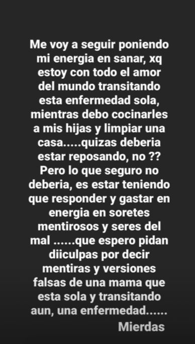 Por último, Nicole Neumann manifestó, furiosa: "Me voy a seguir poniendo mi energía en sanar, porque estoy con todo el amor del mundo transitando esta enfermedad sola, mientras debo cocinarles a mis hijas y limpia una casa. ¿Quizás debería estar reposando, no? Pero lo que seguro no debería, es estar teniendo que responder y gastar en energía en soretes mentirosos y seres del mal... que espero pidan disculpas por decir mentiras y versiones falsas de una mamá que está sola y transitando aún una enfermedad. Mierdas", cerró, sin dejar en claro si se refería a Cubero y Viciconte o a los integrantes de Intrusos.