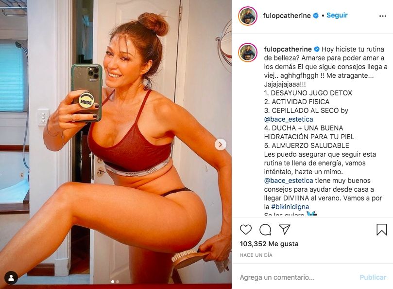Luciendo espléndida, la actriz publicó una foto en Instagram donde se la ve en ropa interior en el baño: "¿Hoy hiciste tu rutina de belleza? Amarse para poder amar a los demás. El que sigue consejos llega a viej..¡¡aghhgfhggh! Me atraganté. ¡¡¡Jajajajajaaa!!!", comenzó diciendo.