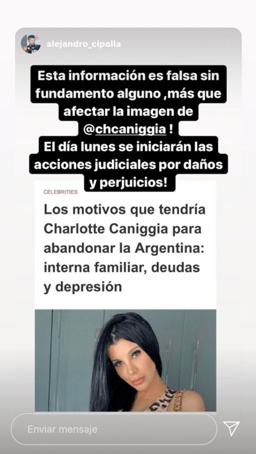 Indignada, la mediática compartió en su cuenta de Instagram la publicación que realizó su abogado Alejandro Cipolla. "Esta información es falsa, sin fundamento alguno más que afectar la imagen de Charlotte. El día lunes se iniciarán las acciones judiciales por daños y perjuicios", se puede leer en el posteo.