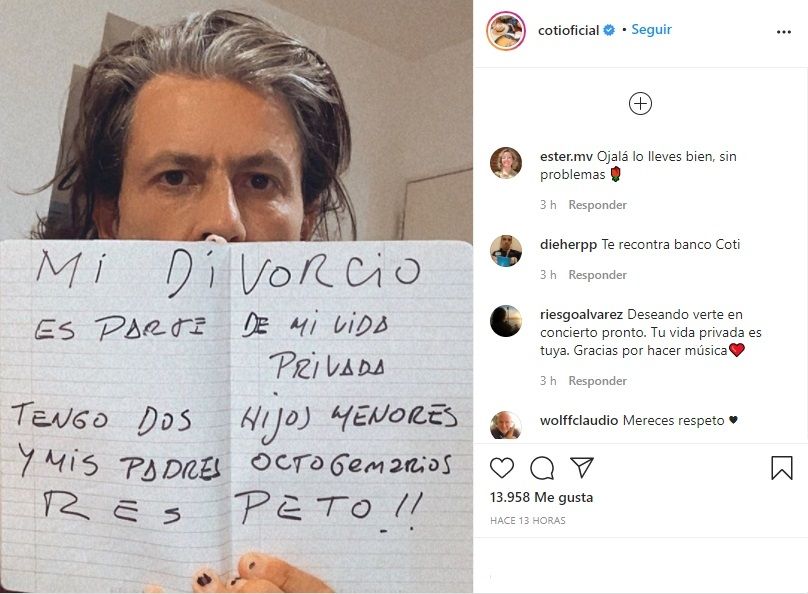"Mi vida son mis hijos y la música no me jodan", escribió en su cuenta de Twitter. Posteriormente subió una imagen de él a Instagram sosteniendo un cartel con el que hizo un contundente pedido: "Mi divorcio es parte de mi vida privada. Tengo dos hijos menores y padres octogenarios. ¡Respeto!".