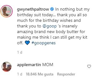 Rápidamente, su hija, Apple Martin, no pudo evitar llamarle la atención por la foto publicada en Instagram. La joven de 16 años publicó en mayúscula: "MAMÁ", dejando entrever el tono de esta simple palabra. Paltrow le respondió con tres emoticones de caritas riéndose.