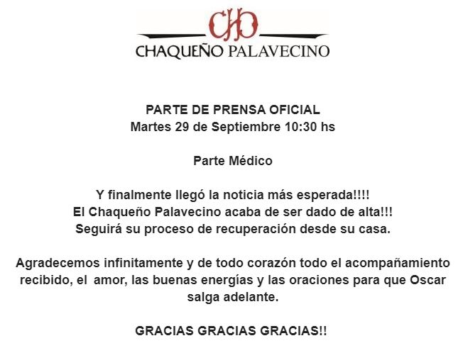 "El Chaqueño Palavecino acaba de ser dado de alta. Seguirá su proceso de recuperación desde su casa. Agradecemos infinitamente y de todo corazón todo el acompañamiento recibido, el amor, las buenas energías y las oraciones para que Oscar salga adelante".