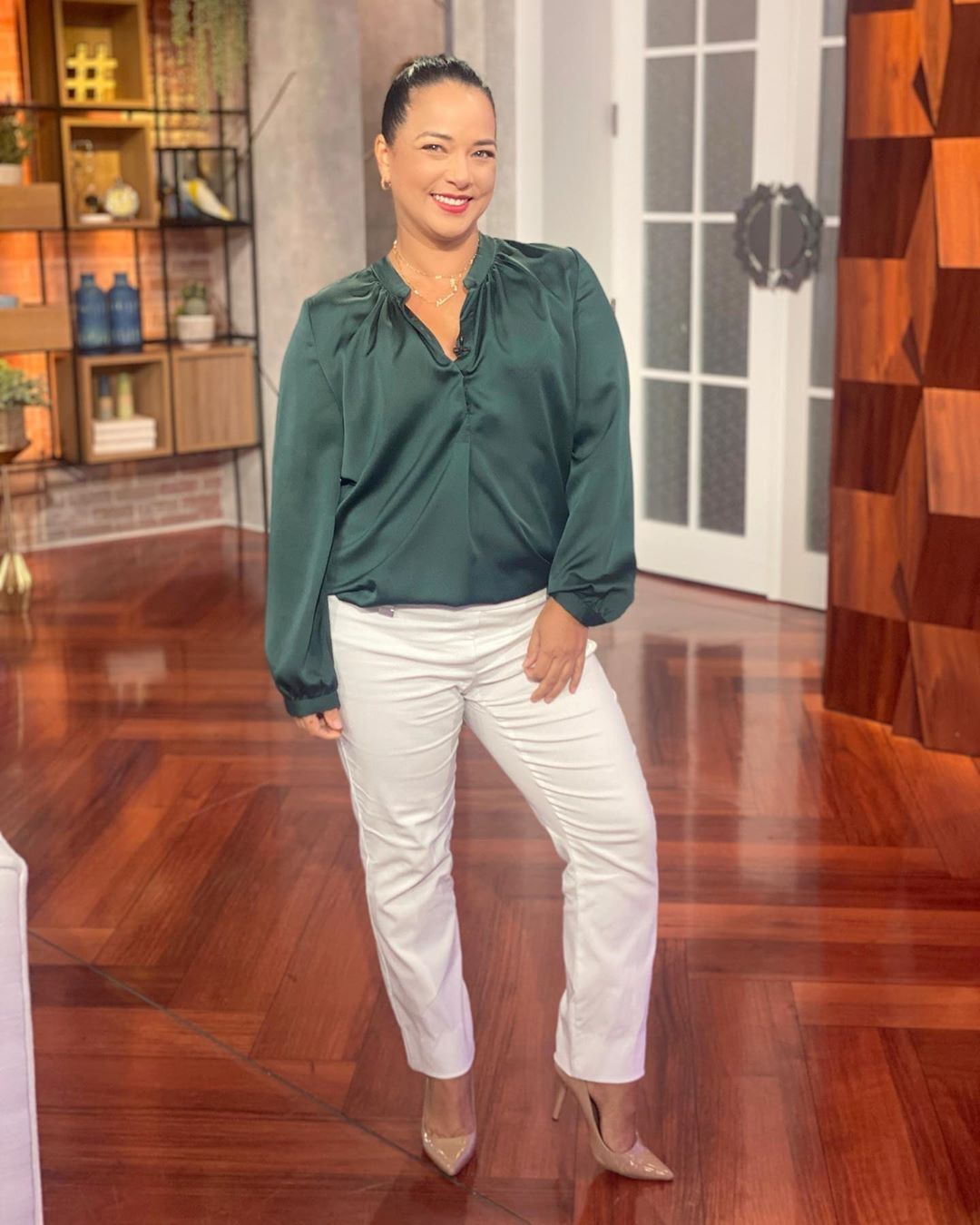 Volviendo a la nueva fotografía compartida por la cuenta de Instagram de “Un Nuevo Día”, en la misma se puede ver a Adamari López luciendo un pantalón largo blanco, una blusa color verde oliva y su cabello recogido.