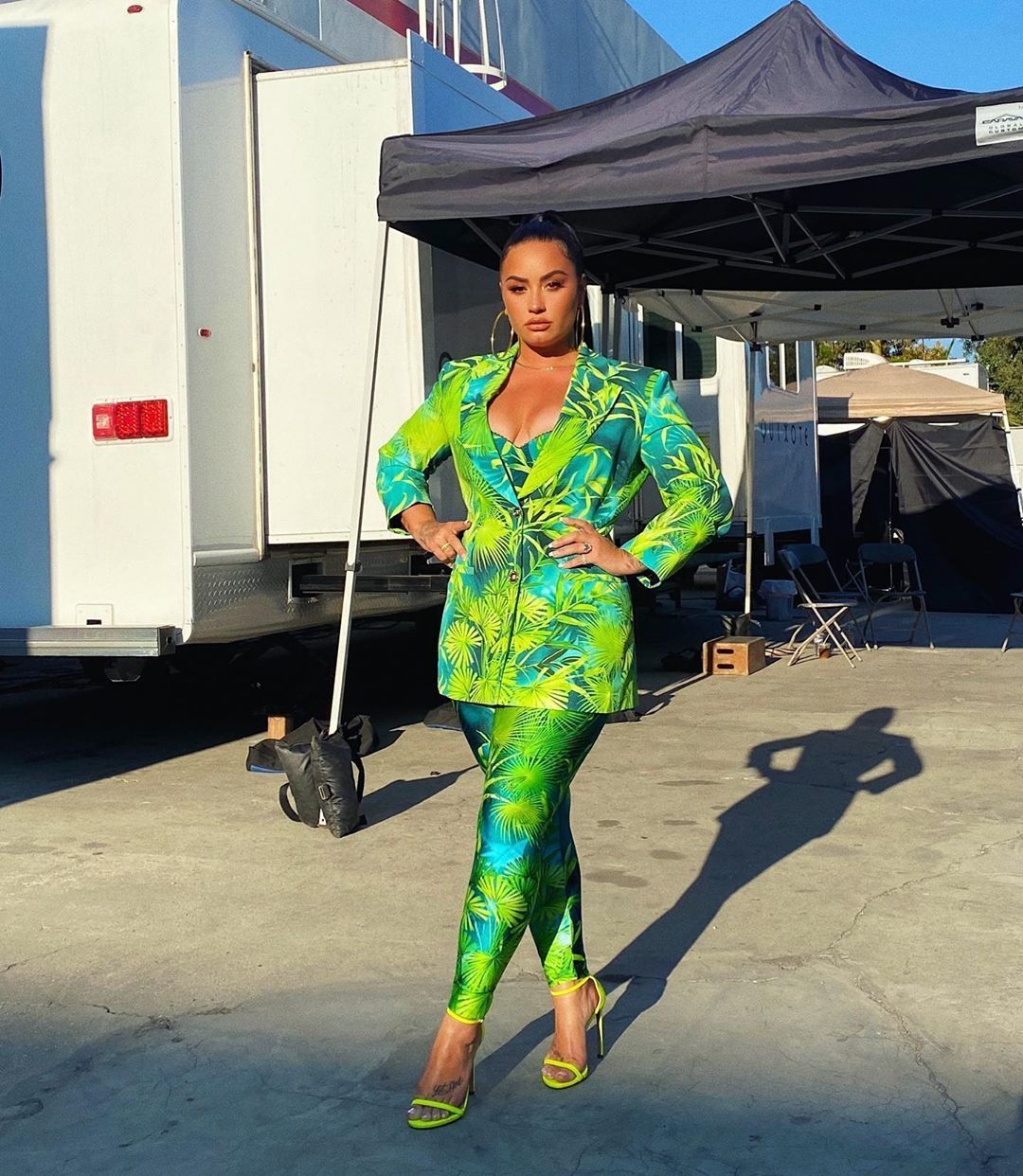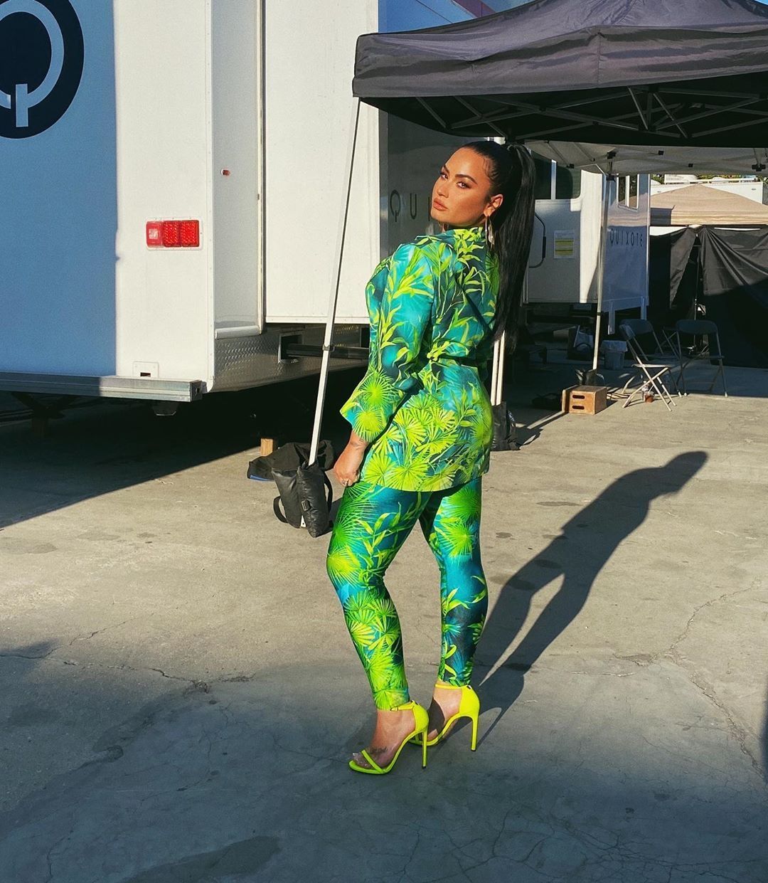 En las últimas horas, Demi Lovato compartió en su cuenta de Instagram personal dos fotografías luciendo un pantalón largo y chaqueta estampada de color verde.
