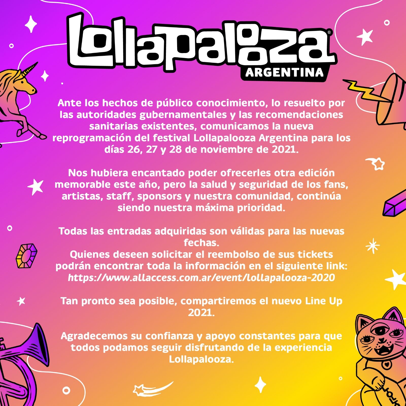 Agradecemos su confianza y apoyo constantes para que todos podamos seguir disfrutando de la experiencia Lollapalooza", dicta el comunicado oficial publicado anoche.