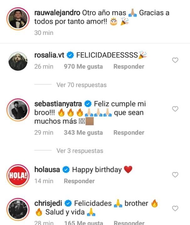 Al igual que la cantante española muchos colegas se manifestaron dejando sus mensajes, entre ellos, Sebastian Yatra, quien escribió "Feliz cumple mi broo!! Que sean muchos más", Natti Natasha también dejó su mensaje "Happy bday", Zion se manifestó "Felicidades vitooooool y muchas más bendiciones para ti en este año".