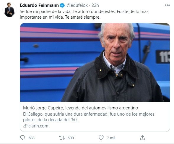 El pasado domingo a sus 83 años, falleció el famoso piloto automovilístico Jorge Cupeiro tras darle batalla a una dura enfermedad. La noticia conmocionó a millones de amantes del deporte y varias figuras de los medios de comunicación lo recordaron con cariño en las redes. Uno de los que sorprendió con su tristeza fue Eduardo Feinmann, quien se mostró muy acongojado con la partida del deportista.
