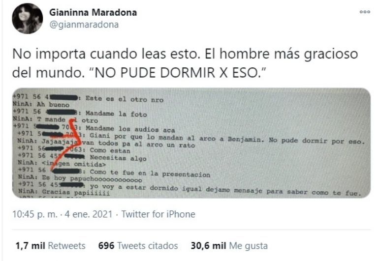 Desde que falleció su padre, Gianinna se ha dedicado a compartir inéditas fotografías y recuerdos del astro del fútbol. Recientemente enseñó un chat que mantuvo con él donde le expresaba una gran preocupación que no lo dejaba conciliar el sueño. “¿Por qué lo mandan al arco a Benjamín? No pude dormir por eso”, le confesó él a su hija mayor y sorprendió a todos en la web.