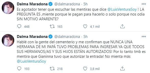 Al enterarse de los dichos del comunicador en la pantalla chica. Dalma salió a responderle con crudeza en su cuenta de Twitter. "Hablé con la gente del cementerio y me confirman que NUNCA UNA HERMANA DE MI PAPÁ TUVO PROBLEMAS PARA INGRESAR YA QUE TODOS SUS HERMANOS/AS Y SUS HIJOS ESTÁN AUTORIZADOS! Por lo tanto también es mentira que Gianinna tuvo que autorizar la entrada! No mienta más Luis Ventura", redactó.