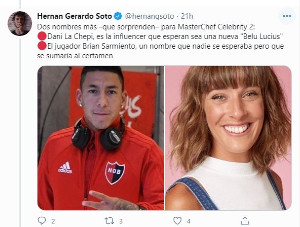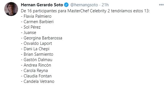 Además, el periodista Hernán Soto reveló nombres de los famosos que están en plena negociación con el canal: Georgina Barbarossa, Osvaldo Laport, Dani La Chepi y el jugador de fútbol Brian Sarmiento. A ellos se suman los de Nicolás Tacho Riera, Carola Reyna y Candela Vetrano.