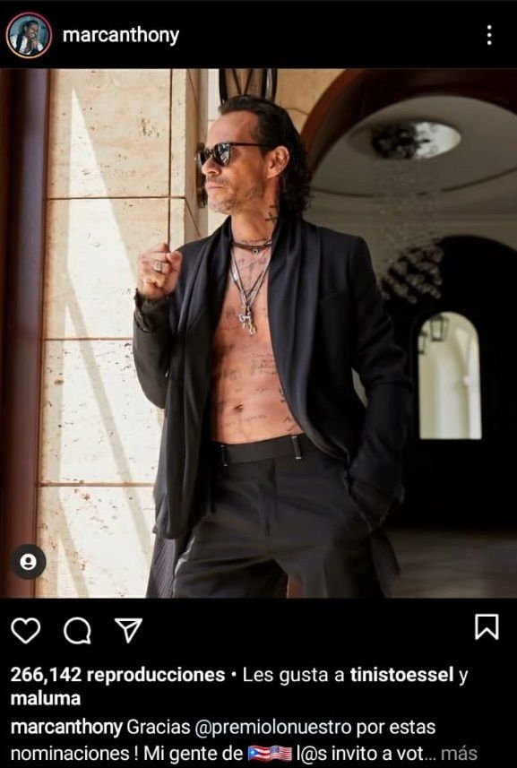 Esta vez no fue la excepción ya que en su última publicación en su perfil de Instagram, Marc Anthony compartió un video donde agradece a los Premios lo nuestro por sus nominaciones con una foto de él donde aparece sin playera. Esta imagen claramente causó la reacción de miles de seguidores y también la de la cantante argentina Tini Stoessel.
