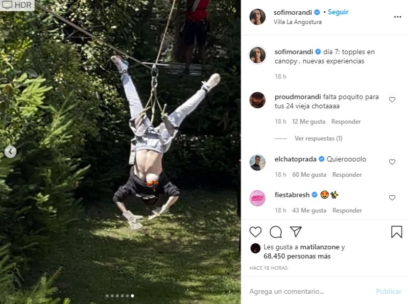 Sofi Morandi se encuentra de vacaciones en nuestra provincia y comparte a diario cada una de sus vivencias. En las últimas horas, protagonizó un blooper cuando hacía tirolesa, ya que se le dio vuelta la remera, y al no usar corpiño mostró de más.