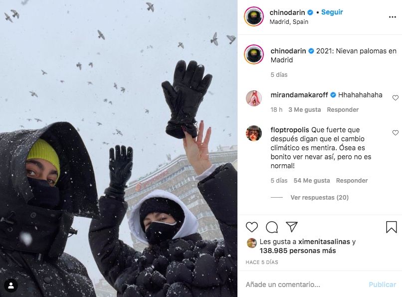 Recientemente, se los vio retratando Madrid bajo la nieve luego del paso del temporal Filomena. En sus historias de Instagram, ambos compartieron distintas imágenes y videos de la ciudad. "Holi Madrid, no entiendo nada", manifestó la actriz. "Pero estoy contenta ¿Vale? Os quiero mucho, ojalá esto no sea el fin del mundo", escribió una de las protagonistas de La casa de papel.