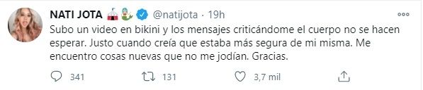 Cansada de los comentarios machistas por su aspecto físico, Nati Jota se descargó en sus redes sociales y se mostró visiblemente afectada por los dichos de la gente. "Subo un video en bikini y los mensajes criticándome el cuerpo no se hacen esperar. Justo cuando creía que estaba más segura de mi misma... me encuentro cosas nuevas que no me jodían. Gracias", escribió en su cuenta de Twitter la periodista de ESPN.