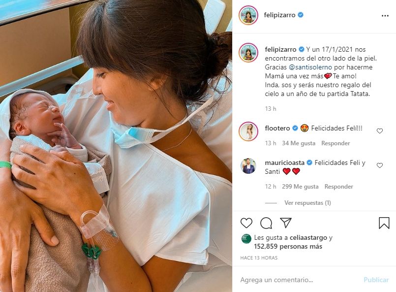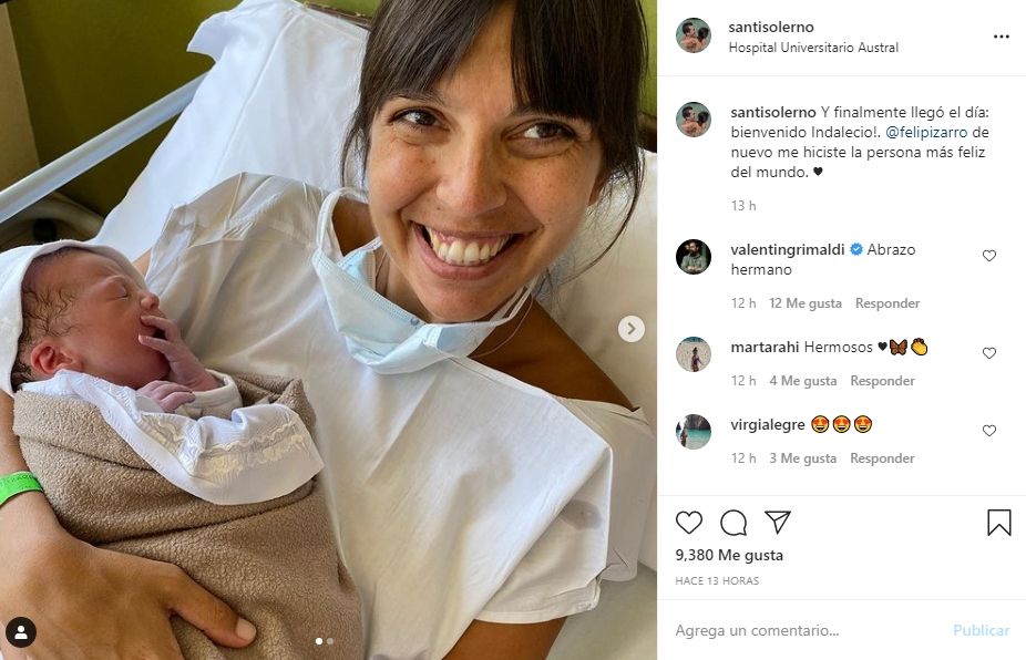 Por su parte, él también compartió una instantánea de la flamante mamá con el niño en brazos en el Hospital Universitario Austral. "Y finalmente llegó el día: bienvenido Indalecio!. @felipizarro de nuevo me hiciste la persona más feliz del mundo", escribió él junto a un emoticón de corazón.