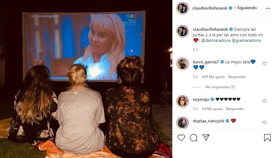 "Siempre así, juntas y a la par. Las amo con todo el corazón", publicó en su cuenta de Instagram, junto a una foto en la que se la podía con Dalma y Gianinna en el jardín de su casa con un proyector gigante viendo MasterChef.