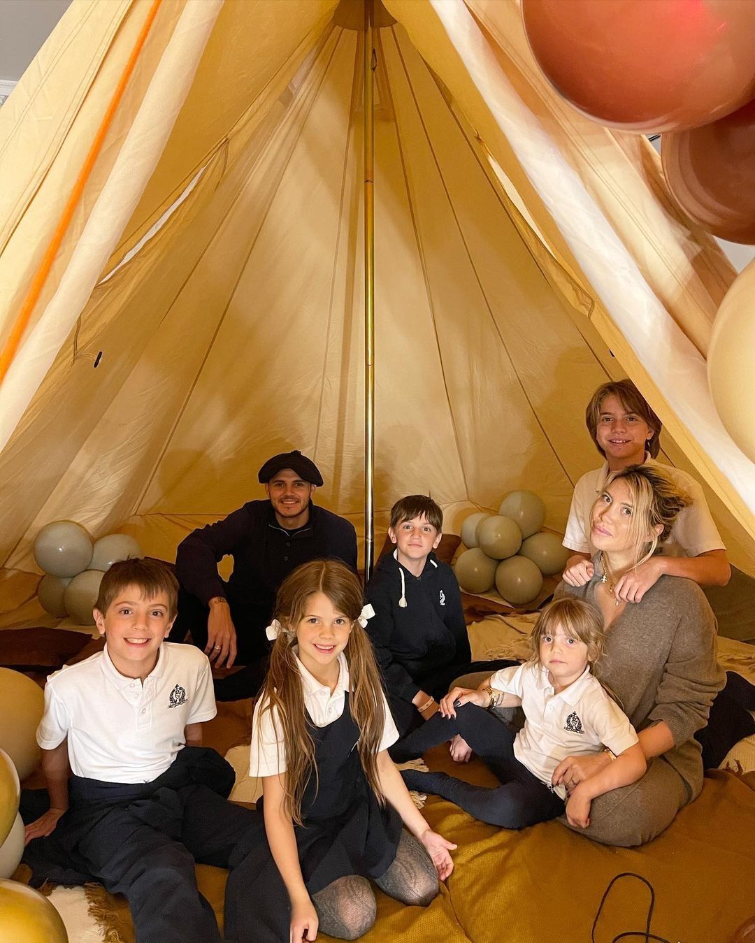 "Hoy acampamos en el living de Casa , para el cumple de nuestra aventurera Francesca", publicó Wanda en sus redes junto a esta foto, donde se lo ve a Mauro Icardi a Valentino, Constantino y Benedicto, hijos de su relación con Maxi López, a la cumpleañera y a Isabella Icardi.