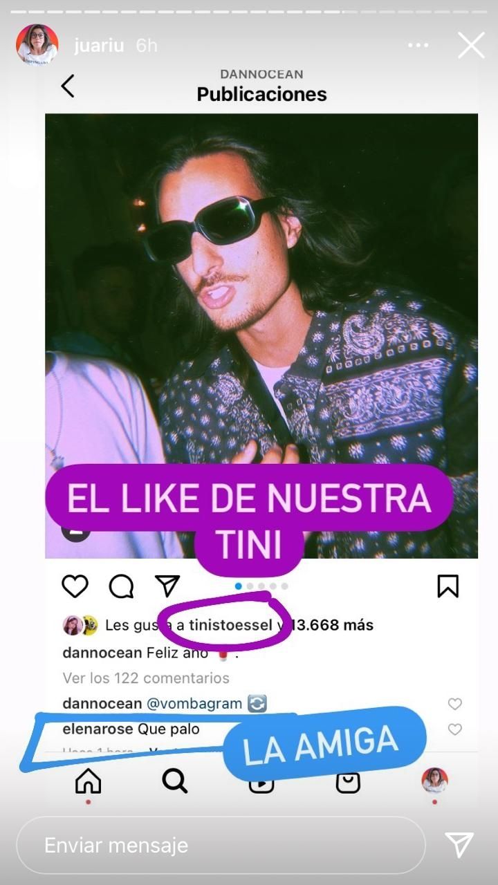 Es que en una foto que Danny Ocean compartió se lo ve bebiendo de un vaso rojo muy particular y en una foto que Tini subió tiene el mismo elemento en su mano. ¿Casualidad? Eso no es todo, hay amigos en común dándose likes también. Mirá lo que posteó en sus historias Juariu: