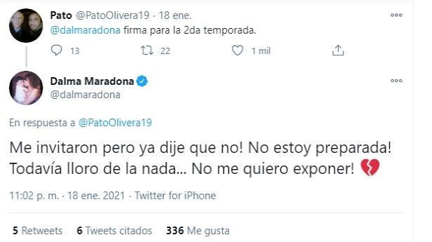 Al ver la imagen, un usuario le sugirió que siguiera los pasos de su madre y formara parte del regreso de Masterchef Celebrity. "Firmá para la segunda temporada”, comentó uno de los 900 mil seguidores de Dalma en Twitter. Sin embargo, la actriz reveló que ya había sido convocada para participar del programa pero que había rechazado la propuesta.