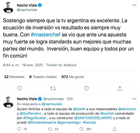 "Sostengo siempre que la tv argentina es excelente. La ecuación de inversión vs resultado es siempre muy buena. Con Masterchef se vio que ante una apuesta muy fuerte se logra standards aun mejores que muchas partes del mundo. Inversión, buen equipo y todos por un fin común!", escribió Viale en su cuenta oficial de Twitter.