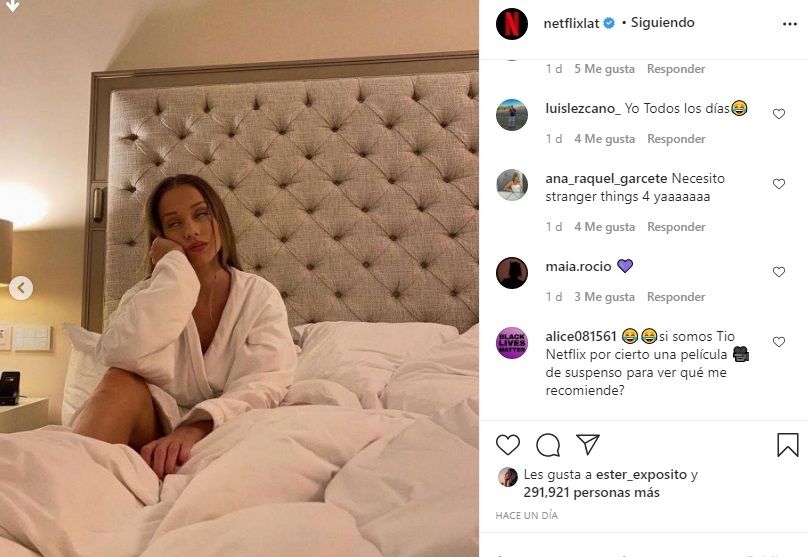 Recientemente en su perfil Instagram, Netflix compartió un par de fotos de ella donde se la ve recostada en la cama con una bata blanca. Además en la descripción la cuenta oficial de la mencionada plataforma escribió: "La segunda foto soy yo todos los lunes". Claramente esta publicación enamoró a todos sus seguidores en la red social.