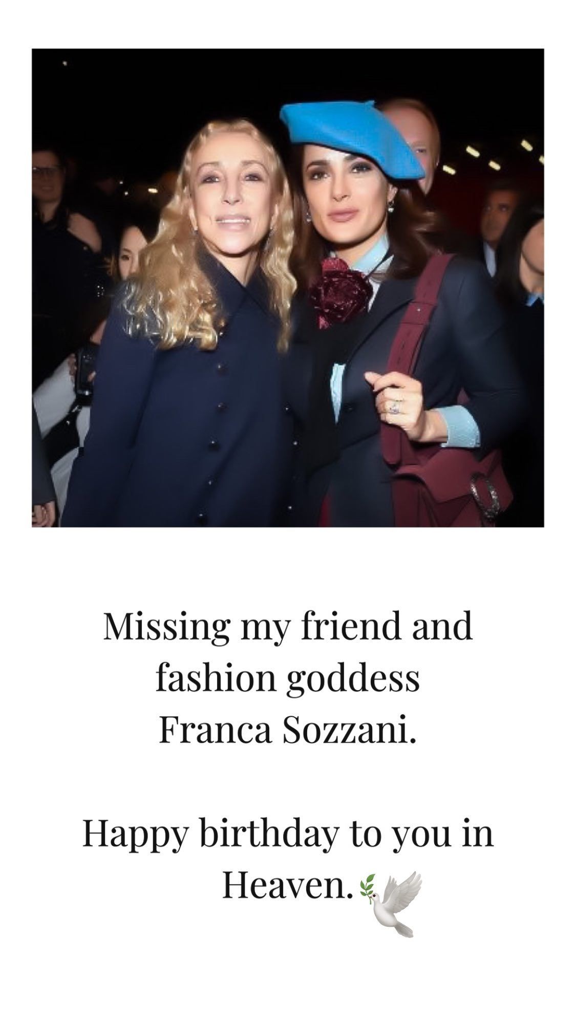 “Extrañando a mi amiga y diosa de la moda Franca Sozzani. Feliz cumpleaños para ti en el cielo” fue el sensible mensaje que compartió Salma junto a su amiga. La oriunda Coatzacoalcos, México luce un saco de color azul marino, cartera borravino, boina azul cielo y una camisa celeste.