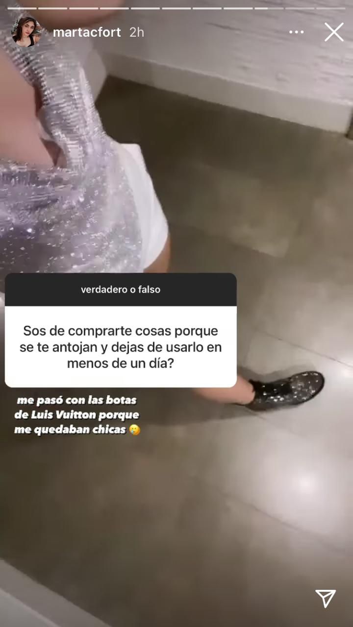 La hija y heredera de Ricardo Fort, Marta Fort, ya tiene 16 años y con su casi medio millón de seguidores es influencer en Instagram. Ayer se copó con la nueva herramienta de la red social: "Verdadero/Falso" y contestó preguntas. En medio de ellas aseguró que no es de comprarse y descartar cosas, pero sí confesó por qué debió dejar de usar unas costosas botas.
