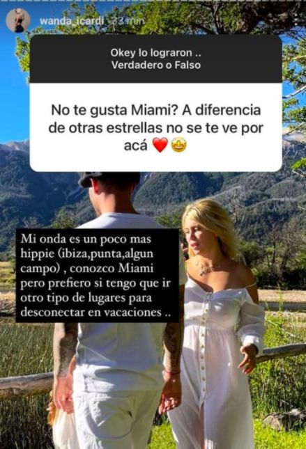 "¿No te gusta Miami? A diferencia de otras estrellas, no se te ve por acá", le consultaron. La empresaria le respondió con un particular punto de vista sobre los destinos turísticos que prefiere. "Mi onda es un poco más hippie. (Ibiza, Punta, algún campo). Conozco Miami, pero prefiero otro tipo de lugares para desconectar en vacaciones", precisó.