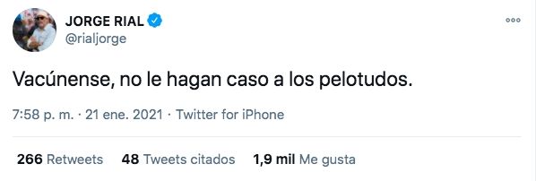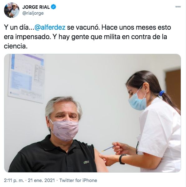 Para reafirmar su postura, Rial apoyó que el presidente, Alberto Fernández, haya recibido la primera dosis de la vacuna contra el Covid-19 en el Hospital Posadas. "Y un día... @alferdez se vacunó. Hace unos meses esto era impensado. Y hay gente que milita en contra de la ciencia", expresó filoso.