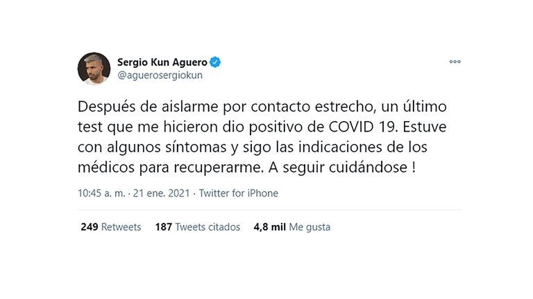 "Después de aislarme por contacto estrecho, un último test que me hicieron dio positivo de COVID 19. Estuve con algunos síntomas y sigo las indicaciones de los médicos para recuperarme. A seguir cuidándose", informó Sergio el Kun Agüero desde su cuenta de Twitter.