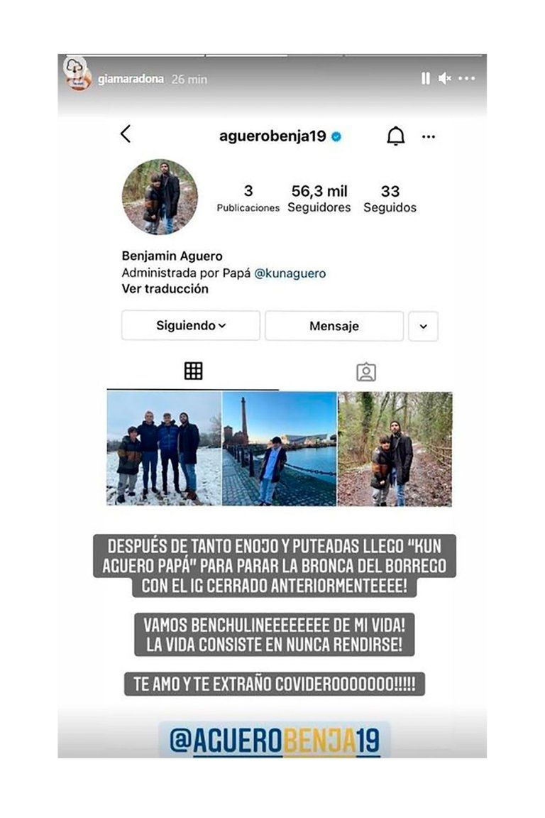 Luego de hacerse un testeo, el pequeño de once años dio positivo y fue el periodista Luis Ventura quien confirmó la noticia, hasta que la menor de las hijas de Diego Maradona, se refirió a su hijo a través de Instagram: "Vamos Benchuline de mi vida, la vida consiste en nunca rendirse! Te amo y te extraño covidero".