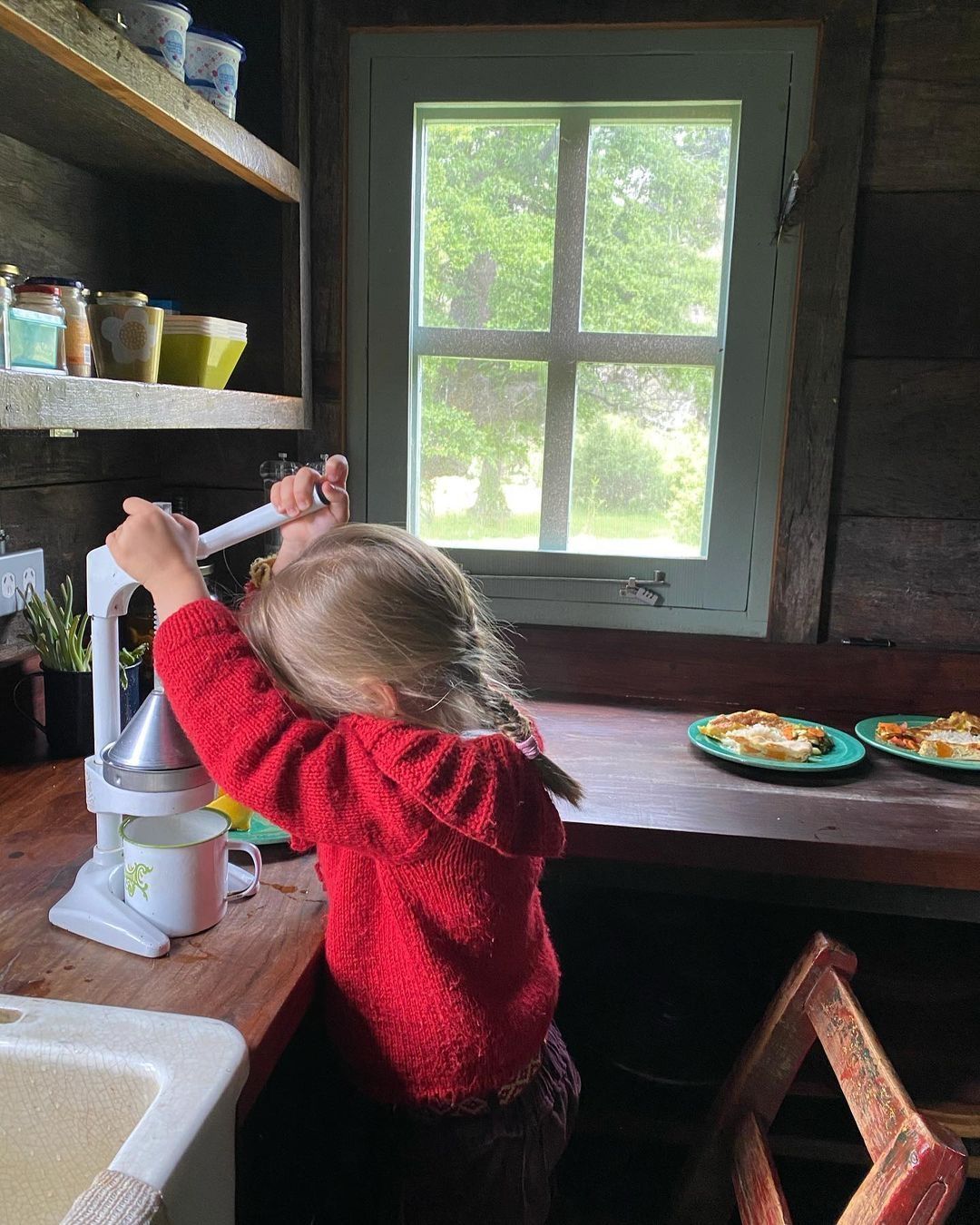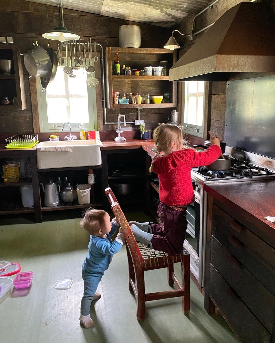 Es que en una está el pequeño Viggo debajo de la hornalla mientras Malaika revuelve la comida, que está al fuego. Ella se encuentra subida en una silla. En la otra, que es menos polémica, la nena está manipulando una juguera.