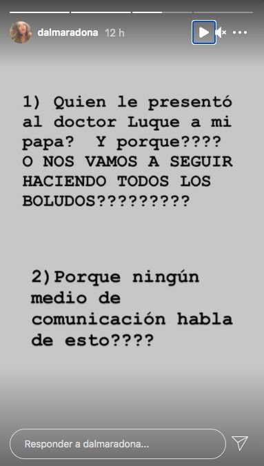 "¿Quién le presentó al doctor (Leopoldo) Luque a mi papá? ¿Y por qué? ¿O nos vamos a seguir haciendo todos los bol...? ¿Por qué ningún medio de comunicación habla de esto?", comenzó expresando la hermana mayor de Gianinna Maradona en un mensaje de Instagram, haciendo alusión al médico de cabecera de su padre, a quien la Justicia aún tiene en la mira.