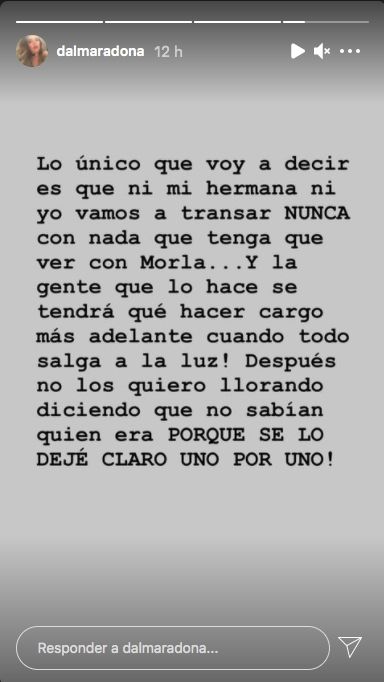 En esa misma línea, la actriz carga contra sus hermanos, Jana y Diego Jr., como así también contra Verónica Ojeda, aunque sin nombrarlos. "Lo único que voy a decir es que ni mi hermana ni yo vamos a tranzar nunca con nada que tenga que ver con Morla", disparó Dalma con respecto a la causa que ahora se retoma.