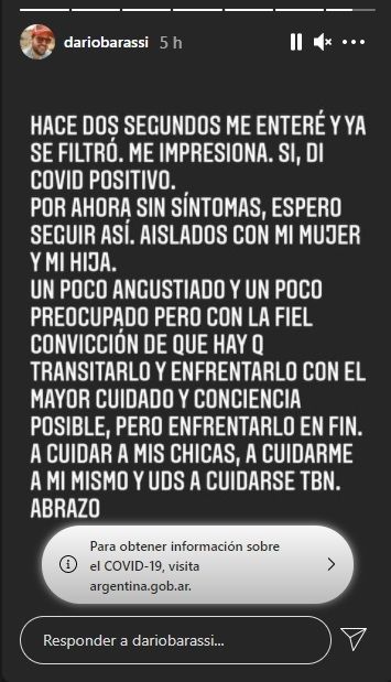 Si hay algo que ha quedado claro en los últimos meses es que por más que se tomen todos los recaudos, nadie está exento de contagiarse de covid-19. El mundo del espectáculo no es la excepción y cada vez son más los famosos que diariamente son diagnosticados positivos. El caso más reciente es el de Darío Barassi.