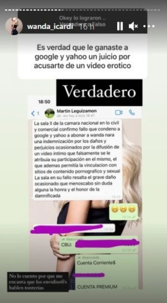 "Verdadero", replicó la empresaria. Luego, Wanda publicó el chat en el que su abogado, Martín Leguizamón, le resumió la sentencia: "La Sala II de la Cámara Nacional en lo civil y comercial confirmó fallo que condenó a Google y Yahoo! a abonar a Wanda Nara una indemnización por los daños y perjuicios".