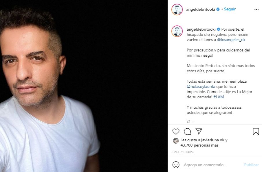 Ayer, Ángel de Brito mostró el resultado negativo de su hisopado. A pesar de no haber contraído el virus, el conductor de Los Ángeles de la Mañana no regresará al programa y en su lugar continuará Laurita Fernández.