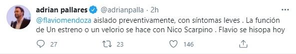 "Flavio Mendoza fue aislado preventivamente, con síntomas leves. La función de Un estreno o un velorio se hace con Nico Scarpino. Flavio se hisopa hoy", redactó el conductor interino de Intrusos haciendo referencia al espectáculo que el coreógrafo protagoniza en el Teatro Broadway.