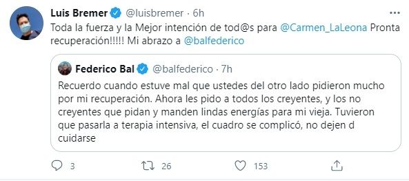 "Toda la fuerza y la mejor intención de todos para Carmen. ¡Pronta recuperación! Mi abrazo a Federico Bal", comentó el periodista Luis Bremer. Sergio Company, Valeria Schapira, Luisa Albinoni y varios famosos más también compartieron la publicación del joven y mandaron las mejores energías para una pronta recuperación de la "La leona".