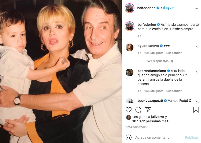 "Así, te abrazamos fuerte para que estés bien. Desde siempre", publicó Fede en su redes sociales junto a una foto donde se los puede ver a él (de pequeño), junto a sus padres Carmen y Santiago Bal en una foto que data de principios de la década del 90.