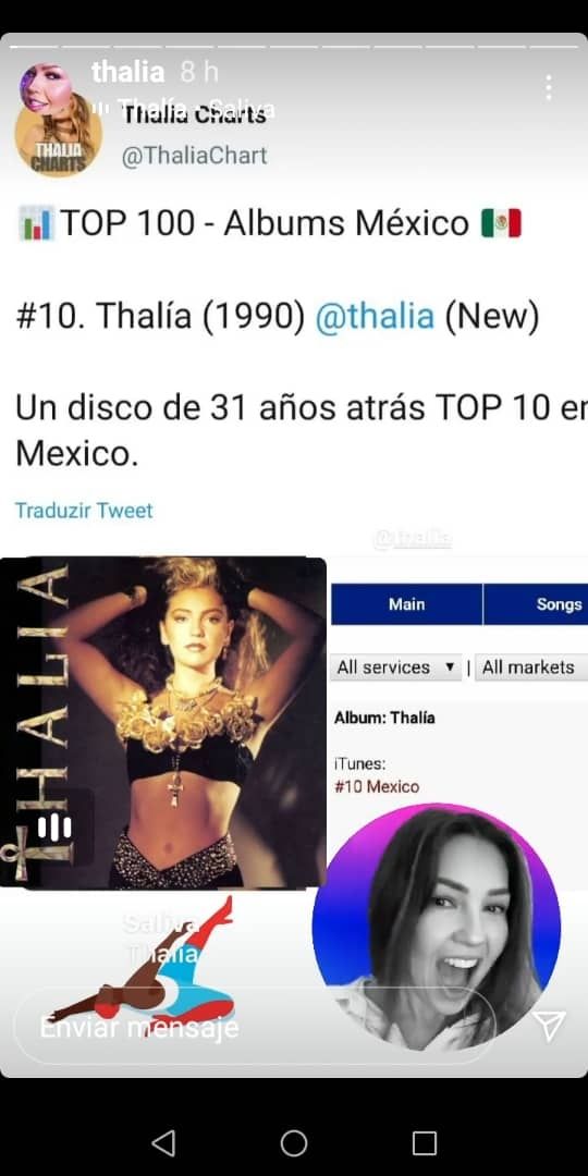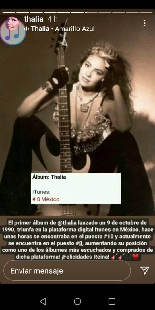 Lo cierto es que, la intérprete del tema "No me acuerdo" conquistó el corazón de todos sus seguidores al compartir en las historias de su Instagram un nuevo récord, ya que su álbum “Thalía”, estrenado en 1990, ocupa la posición número 10 en un ranking de 100 canciones mexicanas, lo más sorprendente es que llegó a esta posición después de un día de haber sido incluido en el catálogo de la plataforma digital.