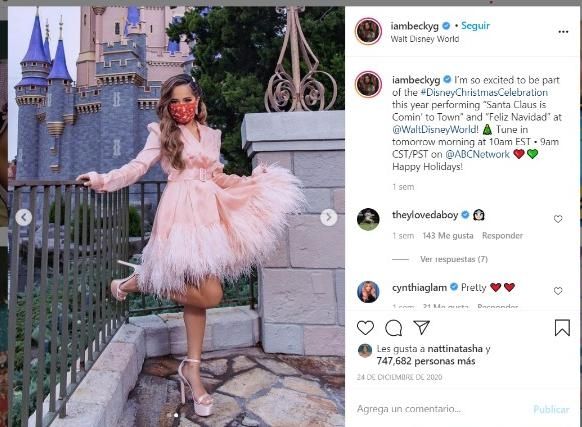 Hace algunos días la intérprete del tema "Sin pijama" compartió en su cuenta oficial en Instagram un carrusel de tres fotografías, donde presume un estilo de una princesa como en los cuentos de hadas en color rosa, en fondo se puede apreciar el castillo de Disney. Indicando que formaría parte de la programación de esta reconocida firma.