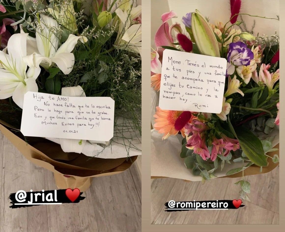 Minutos antes de estrenar, la joven compartió en su Instagram el tierno gesto que tuvieron con ella. "Hija te amo. No hace falta que te lo escriba, pero lo hago para que se te grabe. Eso y que tenés una familia que te banca. Muchos éxitos para hoy", escribió Jorge en una tarjeta junto a un hermoso ramo de flores.