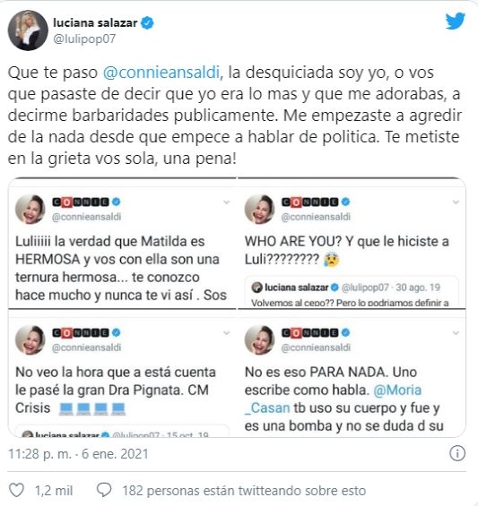 Anoche se desató una batalla campal en Twitter entre Luciana Salazar y Connie Ansaldi luego que la expanelista dijera en Los Ángeles de la Mañana que tanto la rubia como Martín Redrado, su ex pareja, son "dos desquiciados", luego de que Luli expusiera que el economista se separó de su novia por ella y su hija Matilda.