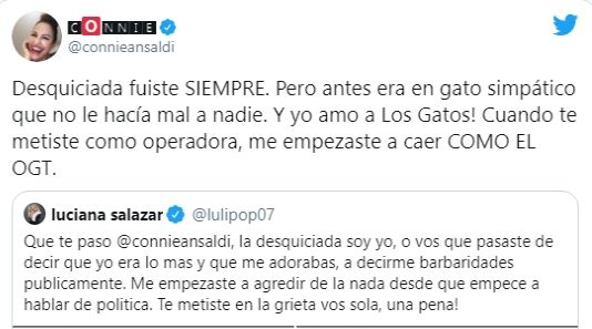 Lejos de quedarse callada, Connie respondió. "Desquiciada fuiste SIEMPRE. Pero antes era en gato simpático que no le hacía mal a nadie. ¡Y yo amo a los gatos! Cuando te metiste como operadora, me empezaste a caer COMO EL OGT".