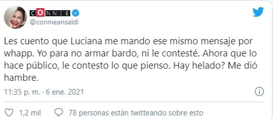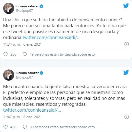 En respuesta, Luciana escribió: "¿Una chica que se tilda tan abierta de pensamiento Connie? Me parece que sos una fantochada entonces. Yo te diría que ese tweet que pusiste es realmente de una desquiciada y ordinaria".