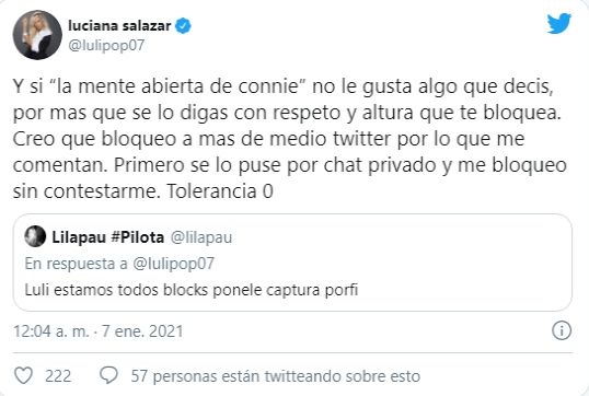 Aprovechando los comentarios que le llegaban, la panelista de Polémica en el Bar (América), lanzó: "Y si 'la mente abierta de Connie' no le gusta algo que decís, por más que se lo digas con respeto y altura que te bloquea. Creo que bloqueo a mas de medio Twitter por lo que me comentan. Primero se lo puse por chat privado y me bloqueo sin contestarme. Tolerancia 0", contestó a la tuitera @lilapau, conocida en la red.