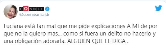 Mientras tanto, la directora de Nuclear Branding, empresa de estrategia digital, arremetió en otro tuit: "Luciana está tan mal que me pide explicaciones A MI de por que no la quiero más... como si fuera un delito no hacerlo y una obligación adorarla. ALGUIEN QUE LE DIGA".