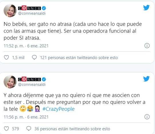 Tras algunos mensajes que le llegaron sobre el término "gato" que utilizó para describir a Luciana, Connie dijo: "No bebés, ser gato no atrasa (cada uno hace lo que puede con las armas que tiene). Ser una operadora funcional al poder SI atrasa".