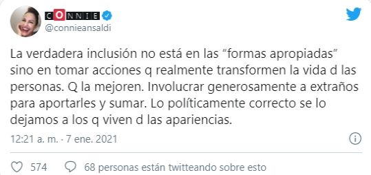 "Y ahora déjenme que ya no quiero ni que me asocien con este ser. Después me preguntan por que no quiero volver a la tele", sentenció contundente. "La verdadera inclusión no está en las 'formas apropiadas' sino en tomar acciones que realmente transformen la vida de las personas. Que la mejoren. Involucrar generosamente a extraños para aportarles y sumar. Lo políticamente correcto se lo dejamos a los que viven de las apariencias", agregó.